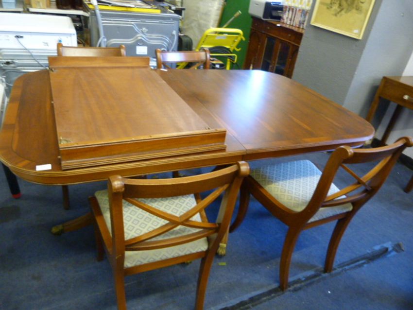 Yew Wood Veneered Extending Dining Table on Twin Pedestal with Four Chairs