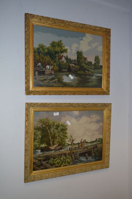Pair of Gilt Framed Woolwork Tapestry Pictures "Country Scenes"