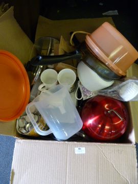 Box Containing Ice Bucket, Mugs, Pans, VHS Player, etc.