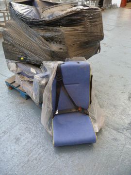 *Pallet of Blue Upholstered Vehicle Seats with Yellow Piping and Three Point Safety Harnesses