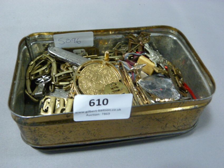 Tin Containing Military Cap Badges, Costume Jewellery, 50p Coins, etc.