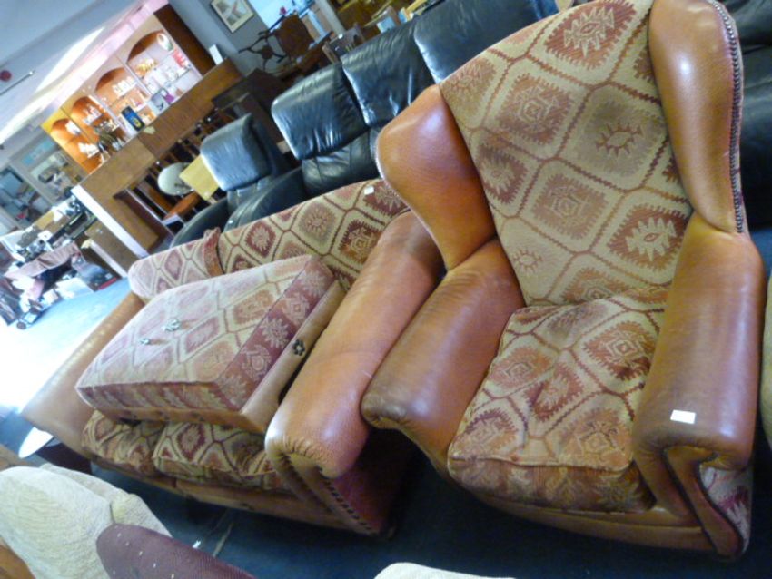 Brown Leather Suite; Large Sofa and Winged Highback Armchair with Pouffe Stool