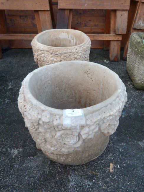 Pair of Reconstituted Limestone Garden Planters with Floral Decoration