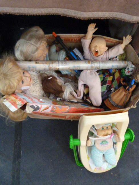Box Containing Porcelain and Plastic Dolls, Rag Dolls, Clowns, etc.