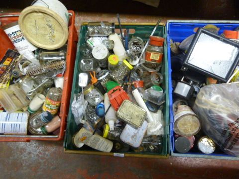 Three Plastic Crates, Assorted Screws, Nails, Bolts, Security Light, etc.
