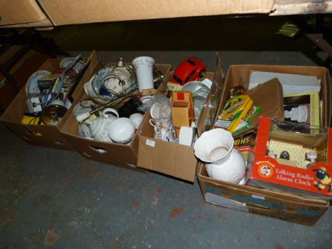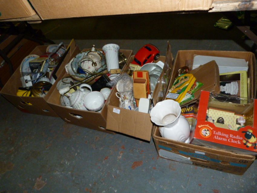 Four Boxes Containing China Dinner Services, Toy Cars, Wallis & Gromit Merchandise, Brass Door Knockers, Table Lamps, etc.