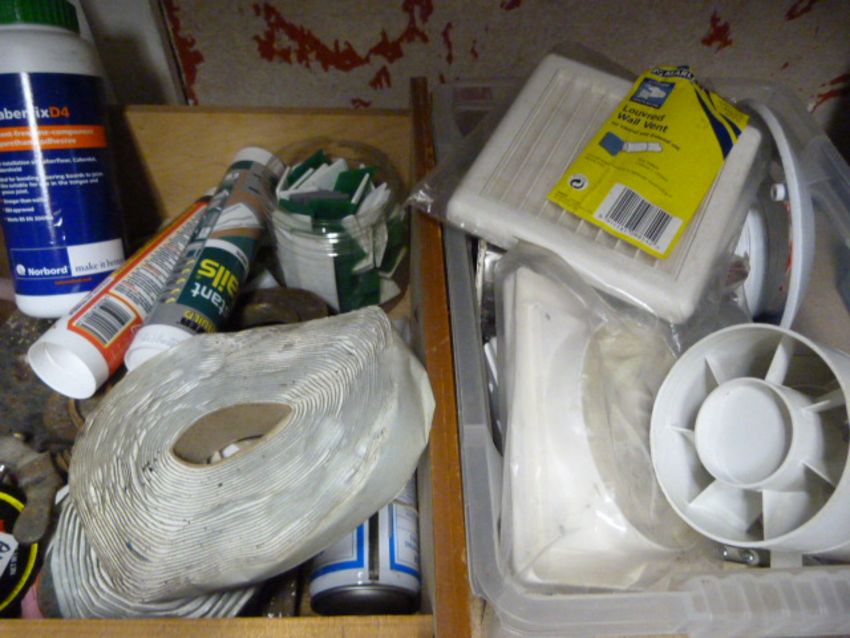 Drawer and a Box Containing Bathroom Fan, Sealants, Adhesives, etc.