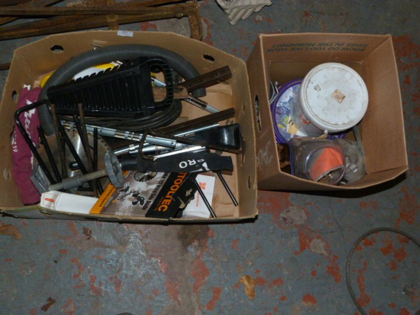 Box Containing Assorted Handtools, Socket Rails, Mitre Saw Blade, Nails, Fixings, etc.