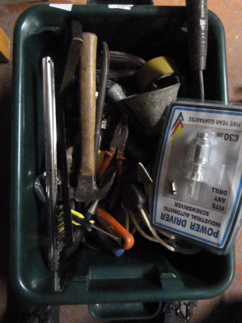 Box of Assorted Tool, Hammers, Cable, Bill Hook, Bell, etc.