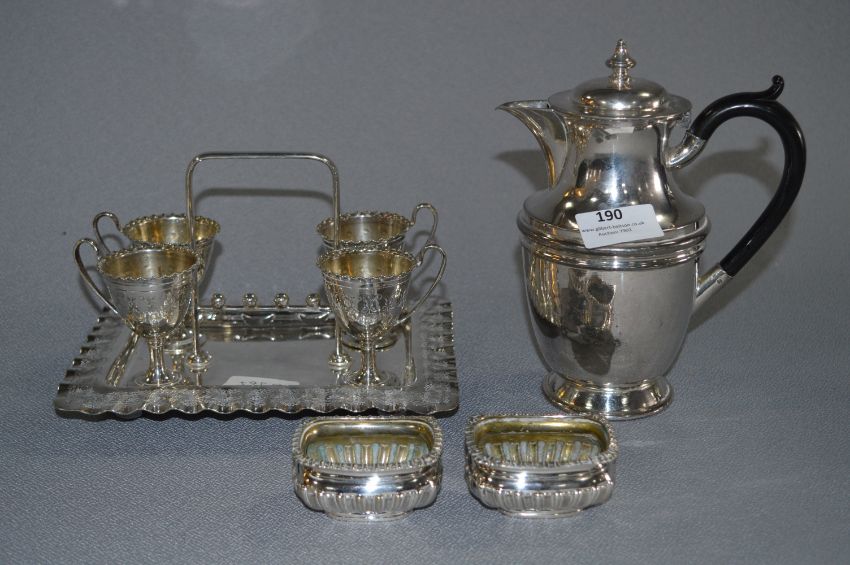 Silver Plated Egg Stand, Pair of Salts and a Coffee Pot