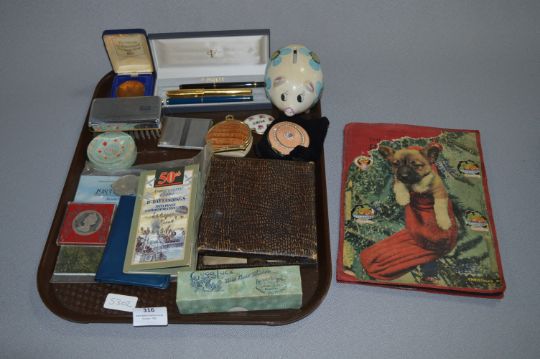 Tray Lot of Collectables; Parker Pens, Commemorative Coins, Money Bank, etc.
