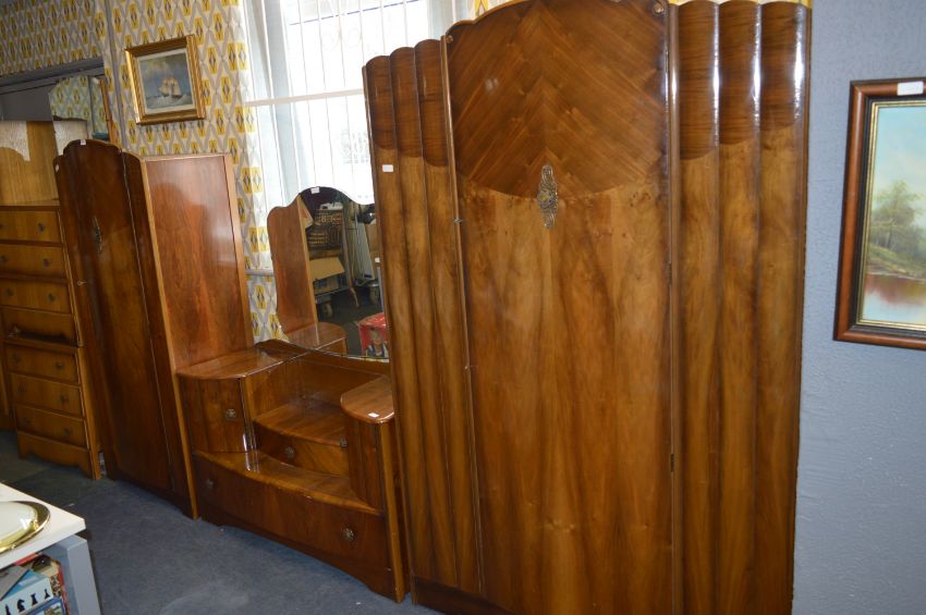 Three Piece Walnut Bedroom Suite; Ladies & Gent Wardrobes and a Dressing Table