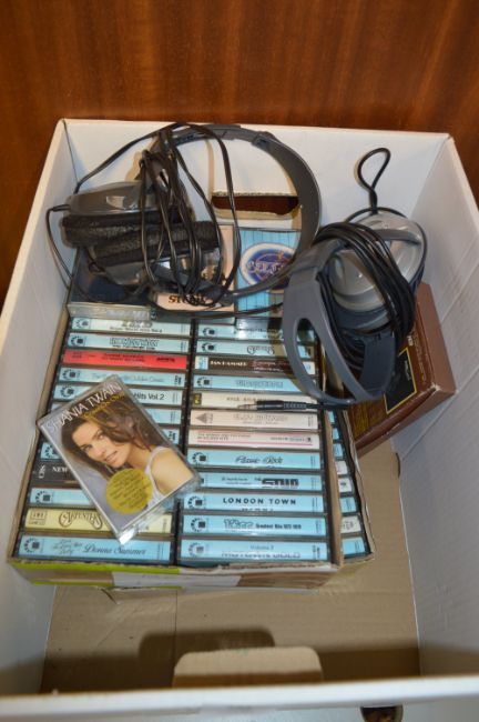 Box Containing 70/80's Cassettes and Two Pairs of Headphones