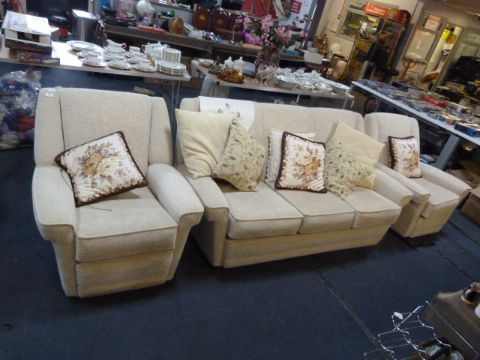 Light Brown Three Piece Suite; Three Seat Sofa and Two Armchairs with Scatter Cushions