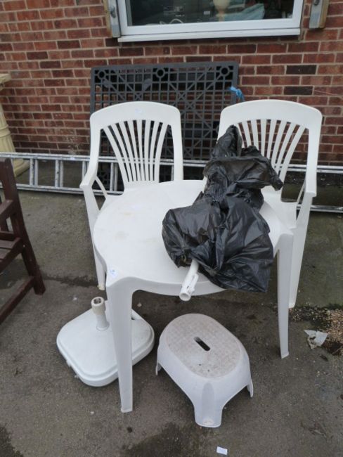 White Plastic Circular Garden Table with Two Chairs and Parasol