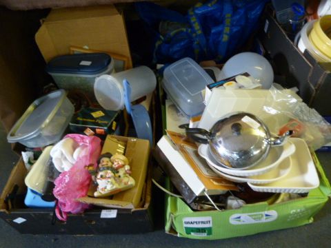 Two Boxes of Kitchen Items; Containers, Can Openers, Multi Steamer, Teapots, Dishes, Ornaments, etc.