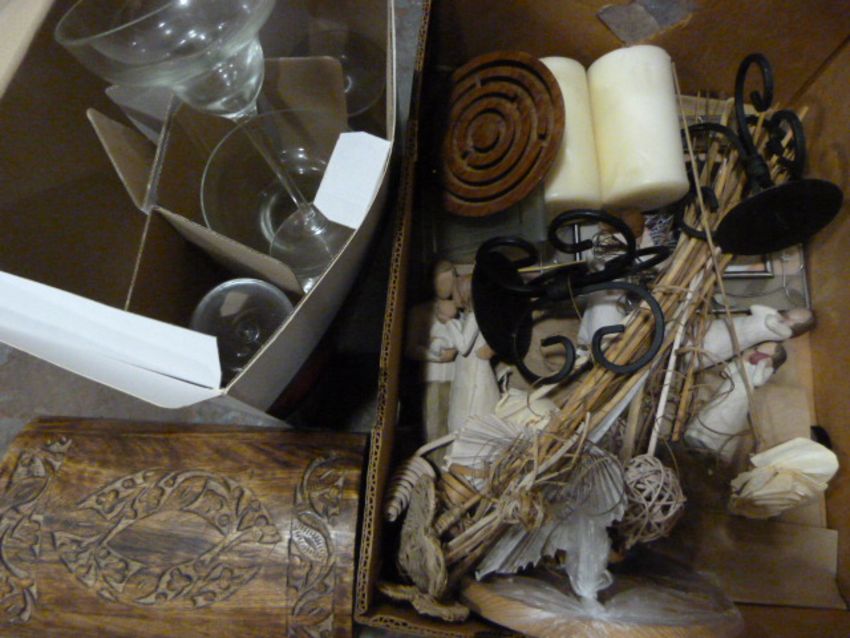 Box of Five Stolzle Wine Glasses and a Box Containing Candlesticks, Carved Wood Box, Wood Figures, Frames, etc.