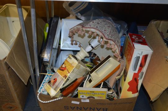 Box Containing Bathroom Scales, Table Lamp, Steam Iron, Heat Wrap, Wellington Boots, Kettle, Cutlery, etc.