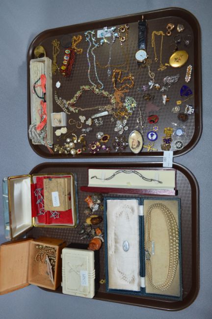 Two Trays of Costume Jewellery; Pearls, Earrings, Pin Badges, Ring, Necklaces, etc.