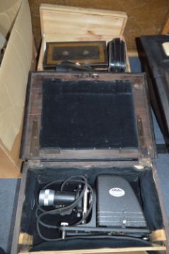 Pine Box Containing Aldis Universal Projector, Cine Camera, Cash Tin, etc.