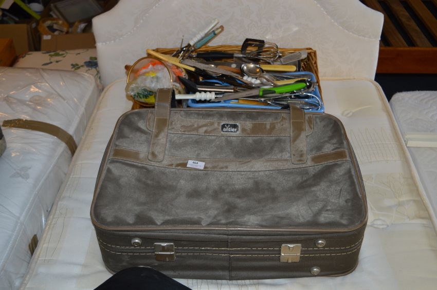 Antler Suitcase, Bathroom Scales and a Basket of Cutlery