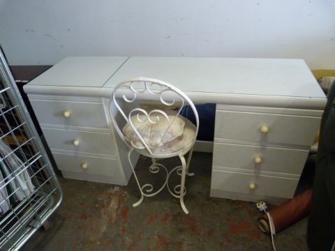Six Drawer Glass Topped White Dressing Table with Chair