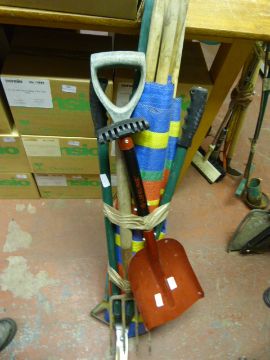 Bundle of Tools Including Shovel, Fork, Windbreak, etc.