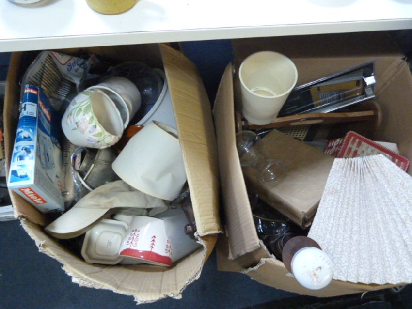 Two Boxes Containing Kitchenware, Table Lamps, Plant Pots, Books, Glassware, Vases, etc.