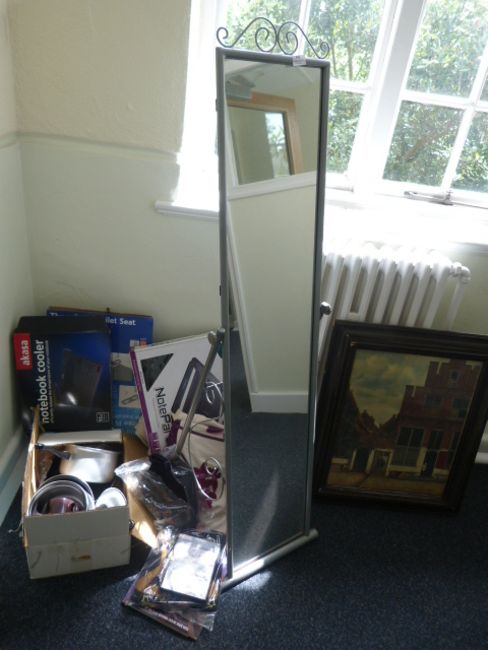 *Edwardian Framed Picture, Cheval Mirror, Pots, Pans, Notebooks, Coolers, etc.