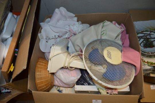 Box Containing Table Cloths, Pan Lids, Fan, etc.