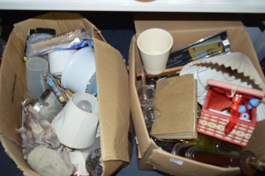 To Large Boxes and Contents of Kitchen Items, Table Lamps, Glassware, Books, Sewing Box, etc.