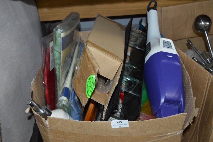 Box Containing Handheld Vacuum, Duster, Ornaments, Candle Burners, Curtains, etc.