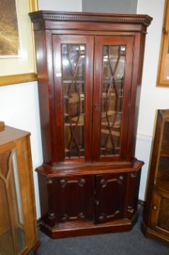 Mahogany Corner Display Cabinet with Carved Panel Base Doors