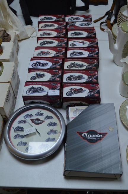 Collection of Sixteen 1:24 Scale Classic Motor Bikes, Clock and Magazines