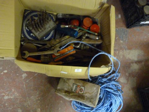 Box of Assorted Tools, Cord, etc.
