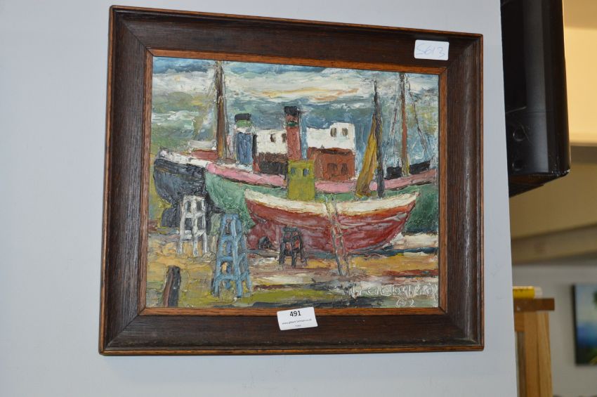 Oak Framed Oil Painting on Board - Boats on Beach