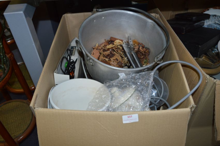 Large Box of Kitchen Ware, Aluminium Pans, Stainless Steel Pans, Storage Jars, Planters, Dinnerware etc