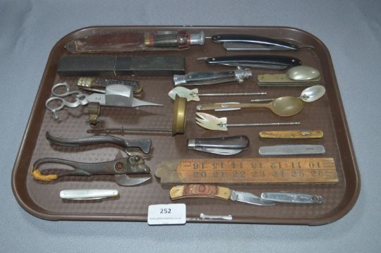 Tray Lot of Pocket Knives, Dagger, Cutthroat Razors, Candle Snuffs, Bottle Openers, etc.