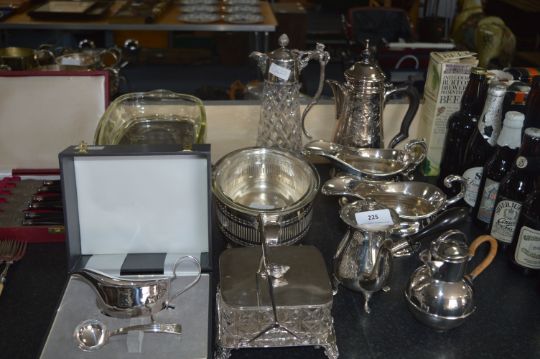 Silver Plated Items; Claret Jug, Serving Dishes, Gravy Boats, etc.