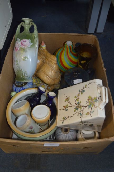 Box of Potter Including Edwardian Vases, Cheese Dome, Potty, Teapot and Glass Vases etc.