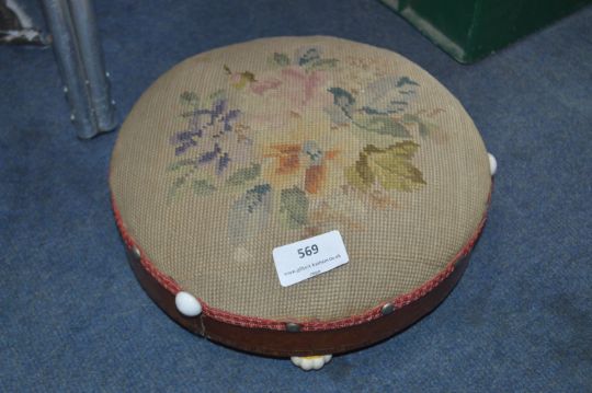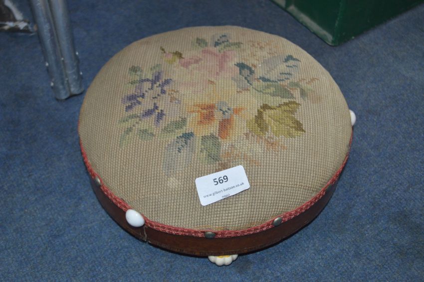Victorian Mahogany Inlaid Footstool with Needlework Tapestry Top