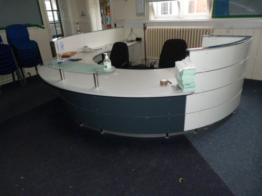 *Curved Contemporary Style Reception Desk with Polished Chrome Edging and High Gloss Panels