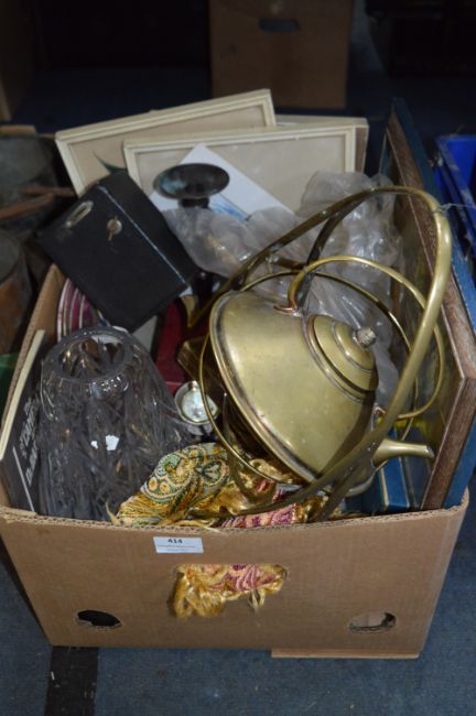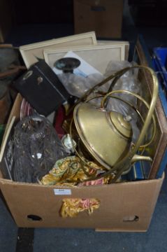 Box Containing Brass Spirit Kettle, Vintage Camera, Candlesticks, Theater Programs, Decorative Plates, Vase, etc.