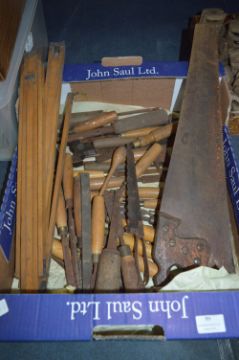 Box Containing Assorted Wood & Brass Carpentry Tools Including Chisels, Hand Saws, etc.