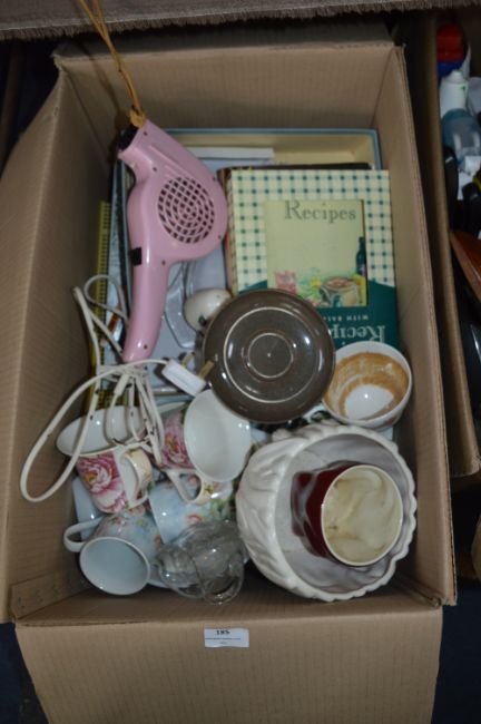 Box Containing Mugs, Dinnerware, Decanters, Cookery Books, Hairdryer, Roasting Dishes, etc.