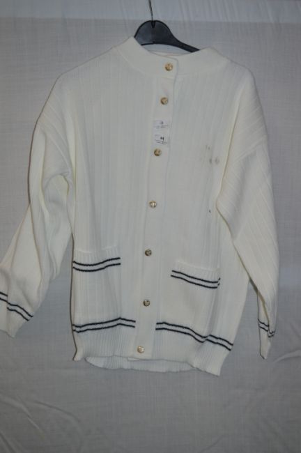 Box of Five White Knitted Cardigans with Blue Trim and Faux Pearl & Gold Buttons
