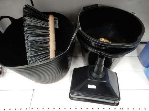 *Three Black Plastic Buckets, Two Sponges, Funnel and a Yard Brush Head