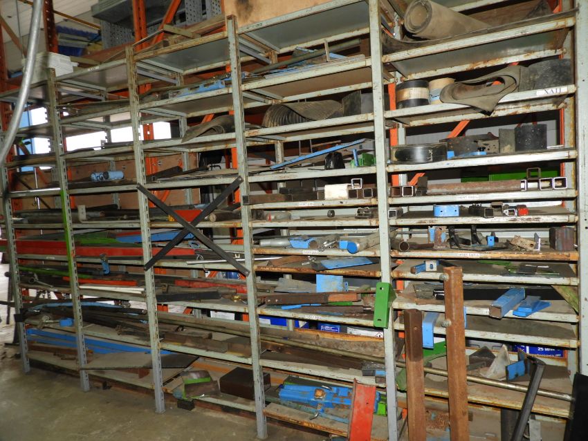 *Five Bays of Boltless Adjustable Shelving Containg Stock of Steel, Hydraulic Pipe, Threaded Bar, etc.
