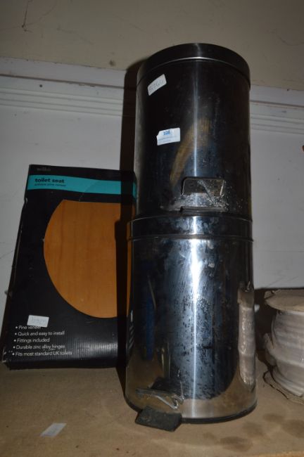 Pine Veneer Toilet Seat and Two Small Pedal Bins