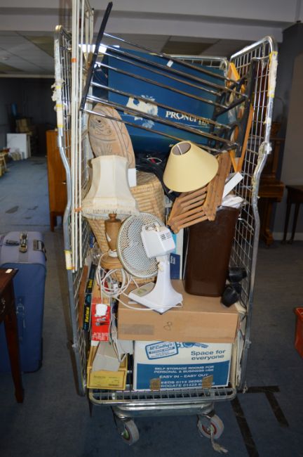 Cage Lot Containing Records, Books, Shoes, Fans, Bric a Brac, Shoe Rack etc